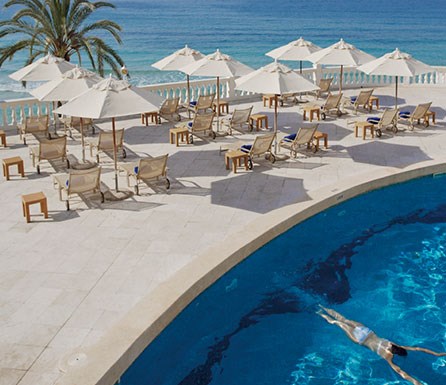 Nixe Palace is a classic looking hotel that seems to be inspired by the allure of the nearby Royal Marivent Palace. Here the luxury does not only consist of the special, unforgettable sea views, the rooms also offer every comfort, luxury and latest technology. All the rooms selected by us are located at the front side at the beach, because at the back you find a busy street – the promenade. The hotel is located in Cala Mayor, directly on the beach and just a few minutes from the lively, historic center of Palma (5 km) and the Puerto Portals marina (5 km). The Paseo Maritimo is 1 km away. An ideal location to enjoy the highlights of this city and its surroundings. The airport is approx. 18 km away.